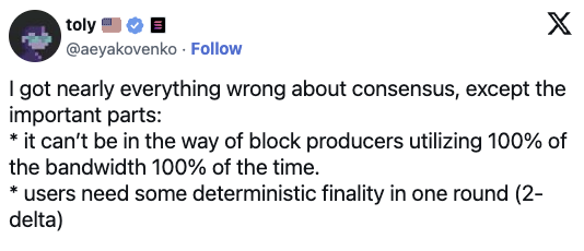 Real-world experience has exposed some challenges for typical Byzantine Fault Tolerance (BFT) consensus systems. While Solana produces blocks every 400ms, true finality (the point where a transaction becomes irreversible) takes an average of 12.8 seconds. Most applications work around this by relying on "optimistic confirmations", which is effectively to bet that a block won't be reversed after 1-2 subsequent blocks. This creates a risk. Apps can never be sure whether their transactions are confirmed or not for 12.8 seconds.